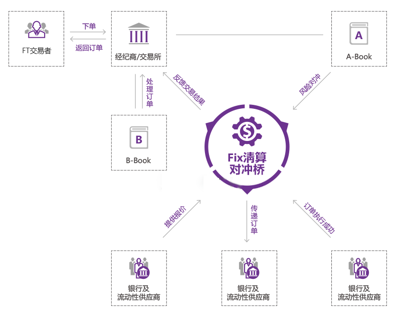 Fix清算桥是一款为贵金属经纪商特定需求设计的风险对冲系统,系统通过API分别连接FT系统Server和上游Liquidity Provider,可以将FT系统内部的头寸直接投放到国际清算机构或者清算对手中,将交易敞口风险转移,同时让经纪商在运营过程中保持中立,有效减少运营风险。